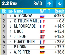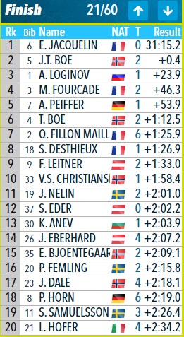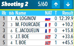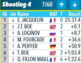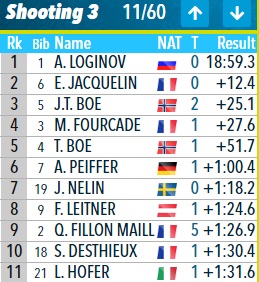 Жакелен не приближается, но приближается Йоханнес, который уже догнал и даже перегнал француза, отставая на +12,6. Фуркад только четвертый. Очень многое решит четвертый рубеж!