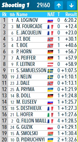 Старт-лист: 1. Александр Логинов (Россия) 2. Кентен Фийон-Майе (Франция) 3. Мартен Фуркад (Франция) 4. Тарьей Бо (Норвегия) 5. Йоханнес Бо (Норвегия) 6. Эмельен Жакелен (Франция) 7. Арнд Пайффер (Германия) 8. Филипп Хорн (Германия) 9. Феликс Лейтнер (Австрия) 10. Дмитрий Пидручный (Украина) 11. Себастьян Самуэльссон (Швеция) 12. Матвей Елисеев (Россия) 13. Мартин Отченаш (Словакия) 14. Бенедикт Долль (Германия) 15. Антон Смольский (Белоруссия) ...17. Тимофей Лапшин (Южная Корея) 18. Симон Дестье (Франция) ...22. Никита Поршнев (Россия) ...33. Ветле Шостад Кристиансен (Норвегия) 34. Флоран Клод (Франция) 35. Эрленд Овренг Бьонтегорд (Норвегия) ...39. Михал Крчмарж (Чехия) ...56. Евгений Гараничев (Россия)