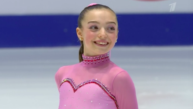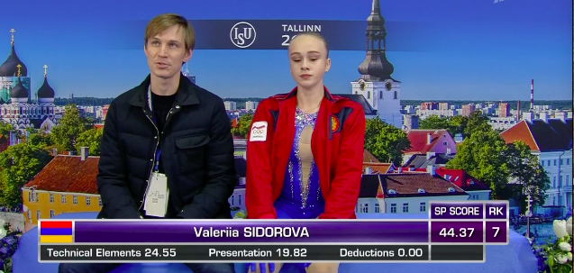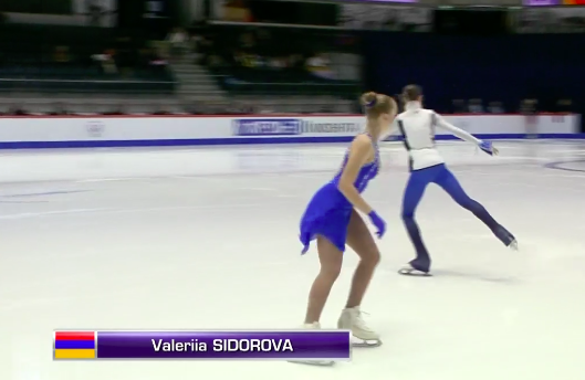 Следующей выступает 15-летняя Валерия Сидорова из Армении! Она катается под саундтрек к фильму «Пятый элемент» (Eric Serra). Тренер наставляет ее словами: «Давай! Давай!»