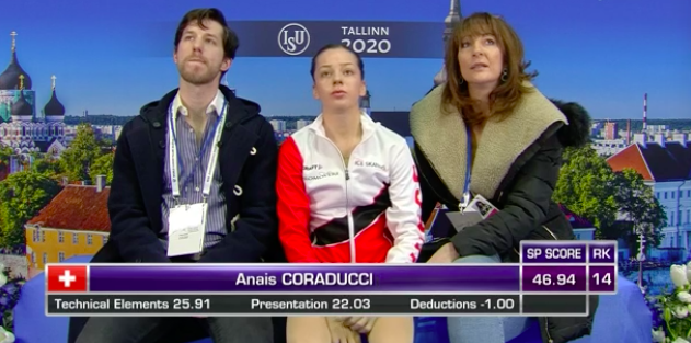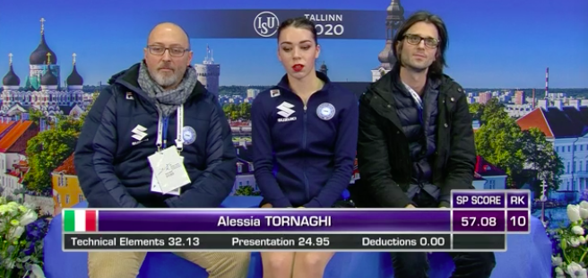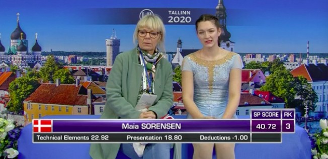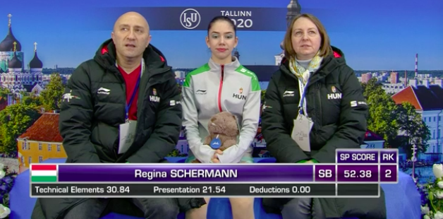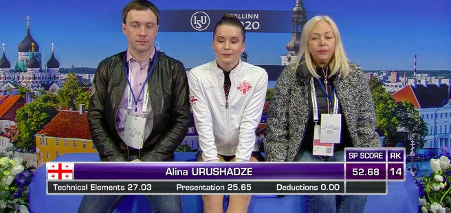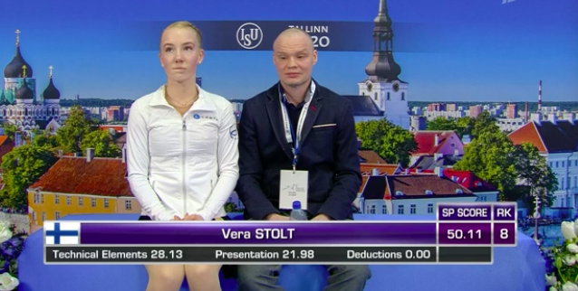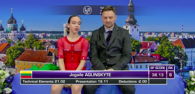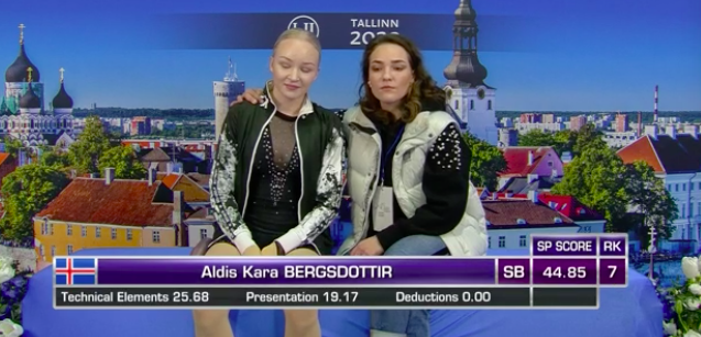 В зоне kiss and cry тренер исландки по-русски передает приветы папе, маме и всем остальным, а затем по-английски начинает хвалить подопечную. Оценки Алдис Кары Бергсдоттир:
