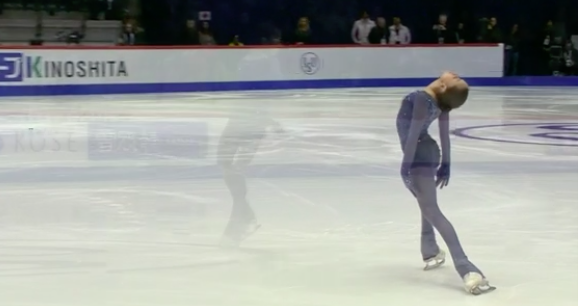 Через красивый заход с наклоном спины назад (инабауэр) девушка исполняет тройной риттбергер, а после него тут же поднимает руки и ноги, принимаю на секунду ту же позу, что на картине, — замечательная отсылка.