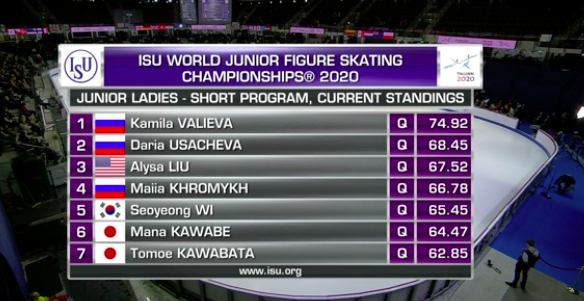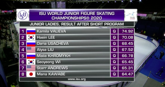 Kamila Valieva leads after the Ladies' Short Program at the ISU World Junior Figure Skating Championships in Tallinn, with Haein Lee second and Daria Usacheva third.#WorldJFigure #FigureSkating