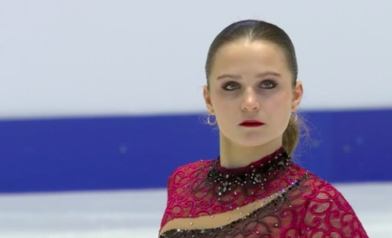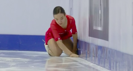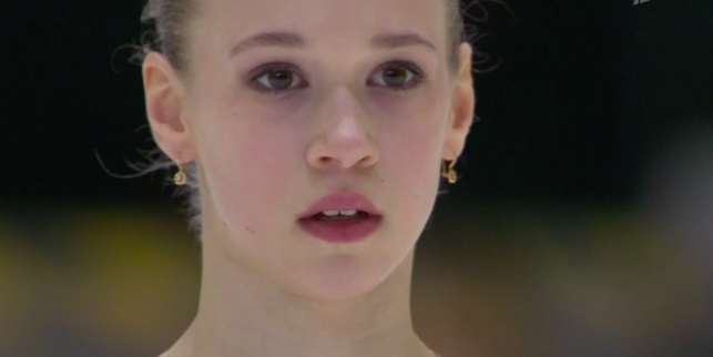 В финальной позе, где Сидорова присаживается на лед, опускает голову и вытягивает одну руку вверх, ее даже отнесло немного в сторону из-за резкого рывка ладони. Девушка явно не очень довольна своим выступлением.