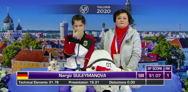Немка завершает программу обязательным для юниоров тройным риттбергером — все прыжки чисто! Тренер встречает Сулейманову со льда и по-русски хвалит ее «Моя умница».
