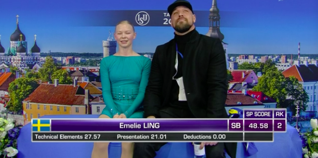 Следующей выступает Эмели Линг из Швеции! Она катается под лирическую мелодию «River Flows in You» (Yiruma). Одинокая болельщица со шведским флагом на палочке приветствует свою соотечественницу.