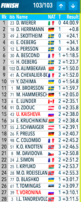 Кайшева финишировала — и действительно она на данный момент выше всех остальных россиянок, на 12-м месте. Проиграла Вирер 2:38,0 минуты. Воронина тоже завершила гонку и пока держится на 20-й строчке (+3:10,1 минуты), Павлова — на 25-й (+3:40,2), а Куклина — на 36-й (+4:44,8).