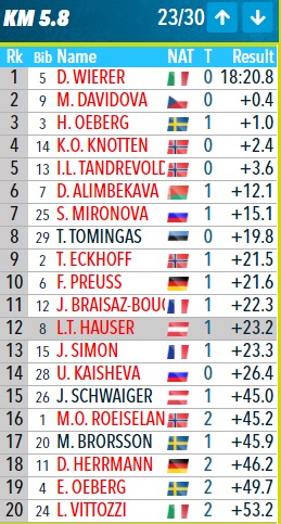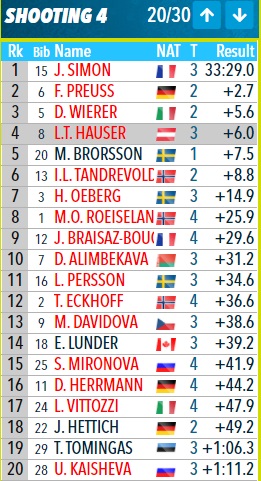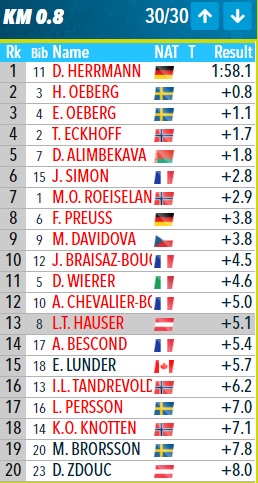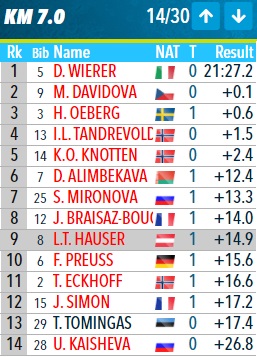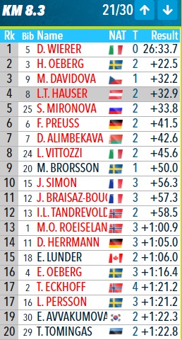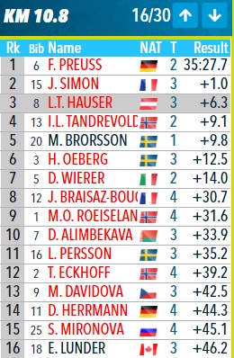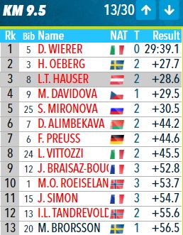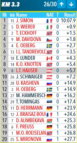 И вот как теперь выглядит топ-20 после заключительного рубежа. Лидирующие Симон и Пройсс отставали от Вирер на 54 и 44 секунды соответственно!