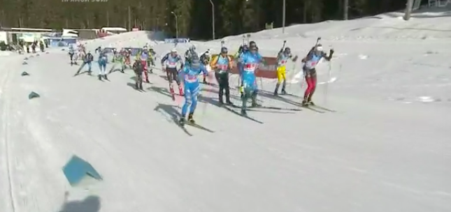 Итальянец Хофер не допустил ни одного промаха и возглавил пелотон, на второй позиции — Бё с одной осечкой, которую он быстро закрыл доппатроном, на третьей — австриец Эдер (без осечек).