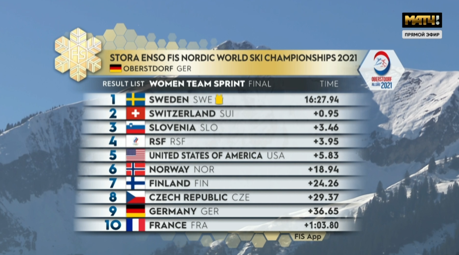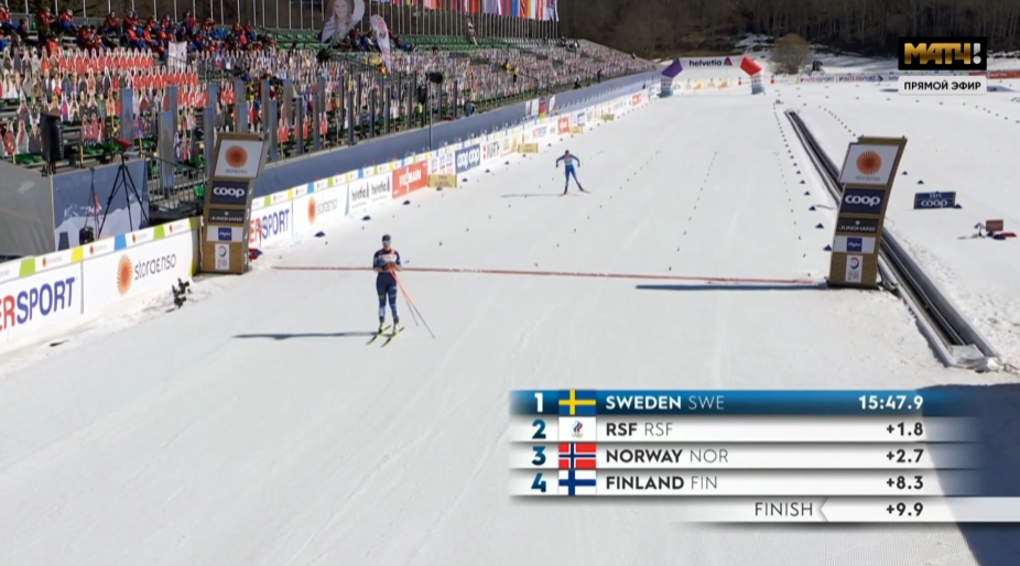 Не накатила на финише Непряева и отпустила слегка шведку, но все равно остаемся вторыми. Далее идут Норвегия и Финляндия.
