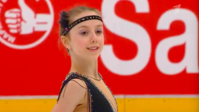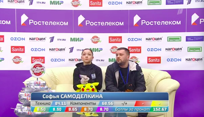 Следующей выступает ученица Сергея Давыдова Софья Самоделкина, от которой мы тоже ждем тройного акселя и четверных прыжков.
