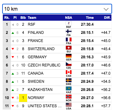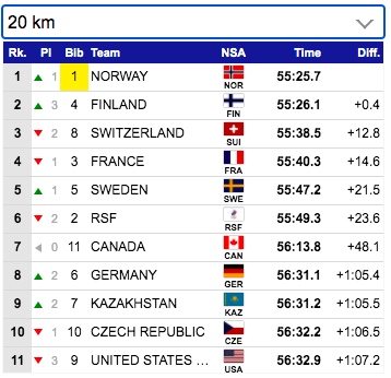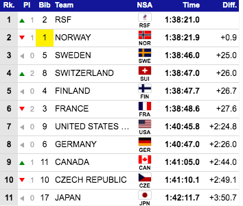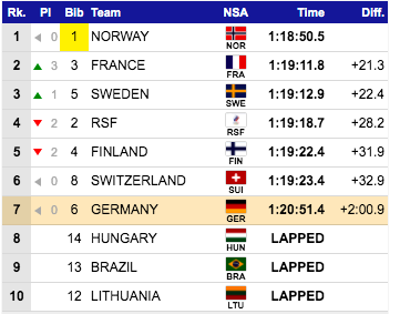 Поздравляем Норвегию с золотом, Россию — с серебром (+12 секунд), а Францию — с бронзой (+1:12,6 минуты)!