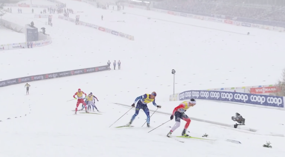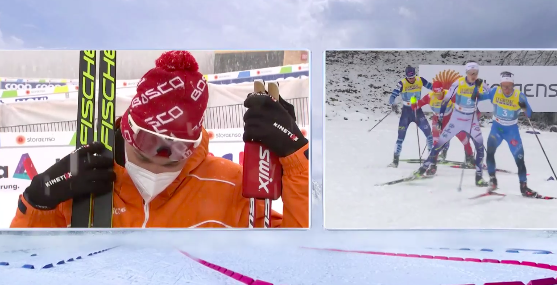 Спустя 4,7 км финального этапа Большунов идет первым, Клебо — прямо за ним (+0,9 секунды), швед Поромаа — третий (+25).