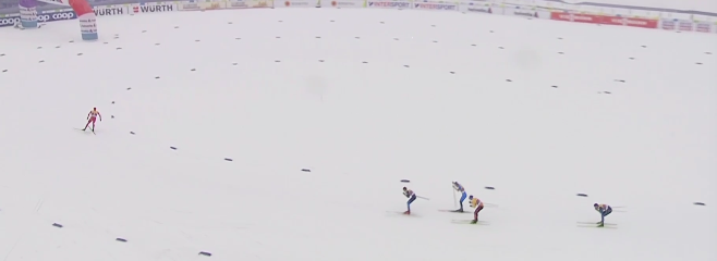 Холунд начал взвинчивать темп, постоянно оглядываясь назад и проверяя, где там Мальцев и другие соперники — а они уже недалеко. Хювяринен кое-как удерживается за спиной норвежца.