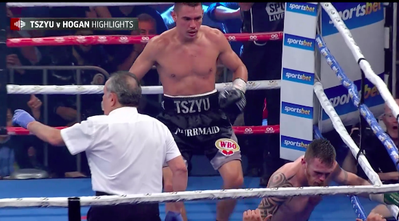 Страшный удар по печени, по голове, еще один и еще! И Хоган просто отворачивается от оппонента и сдается. Он не может больше продолжать. Рефери останавливает поединок! Это 14-я досрочная победа Тима Цзю и 18-я подряд в карьере! Сын российской легенды остается непобежденным боксером.