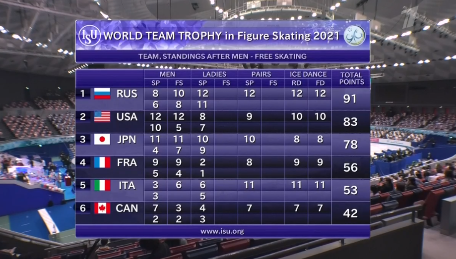 Положение сводной таблицы по итогам танцев на льду. Россия еще больше оторвалась от США и Японии.