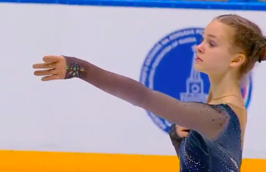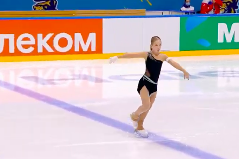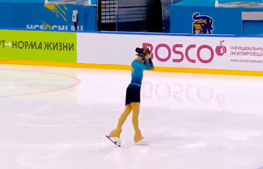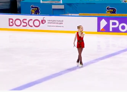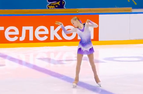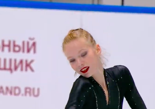 Московская фигуристка спокойно исполнила двойной аксель, тройной лутц, каскад тройной лутц + тройной тулуп, сольный тройной флип, а также каскад тройной риттбергер + двойной тулуп и двойной аксель + ойлер + тройной сальхов.