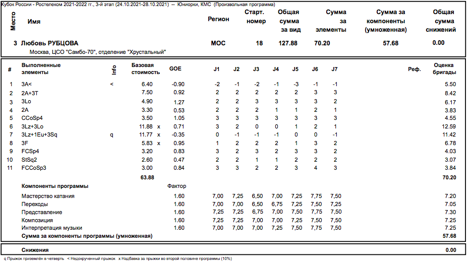 Протокол оценок за произвольную программу бронзовой призерки турнира Любови Рубцовой. Судьи нашли у ученицы Тутберидзе недокрут на тройном акселе.
