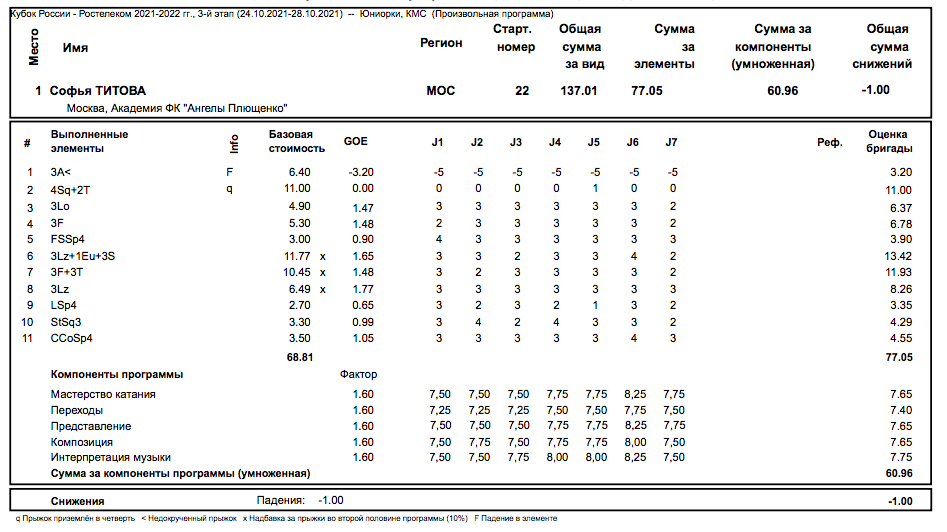 Протокол оценок за произвольную программу победительницы Софьи Титовой. Судьи нашли у нее недокрут в четверть оборота на четверном сальхове, но девушка все-таки смогла устоять, а потом еще и прицепила к нему двойной тулуп.