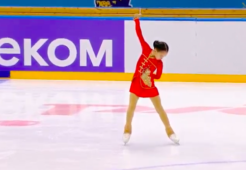 Девушка начала программу со сложного прыжка — тройного лутца — и резко перевалилась на вторую ногу на приземлении, но все же удержалась от падения. Затем последовал каскад тройной лутц + двойной тулуп (скорее всего, хотела сделать 3+3, но не смогла).