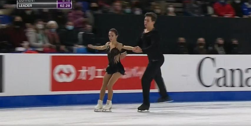 Американцы Эшли Кейн-Гриббл и Тимоти Ледук пока лучшие баллы за технику набирают. Отличное выступление, хотя и были недокрученные прыжки. Тройной риттбергер с ошибкой и тройной каскад вышел с недокрутами во всех прыжках. Может быть, не самые сложные элементы, но очень чисто откатана программа. 128.02 за произвольную программу, в сумме — 189.90. Это новые лидеры.