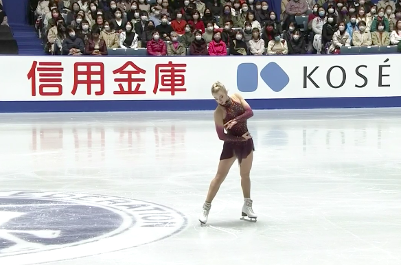 Следующей выступает Каори Сакамото из Японии. Она катается под Now We Are Free (саундтрек к фильму «Гладиатор», авторы — Lisa Gerrard, Hans Zimmer, исполнение — Cedric Tour).