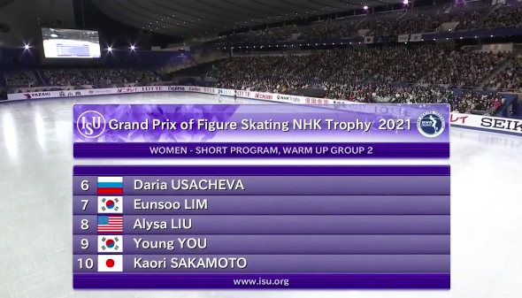 Началась разминка второй группы фигуристок, где мы увидим выступление россиянки Дарьи Усачевой.