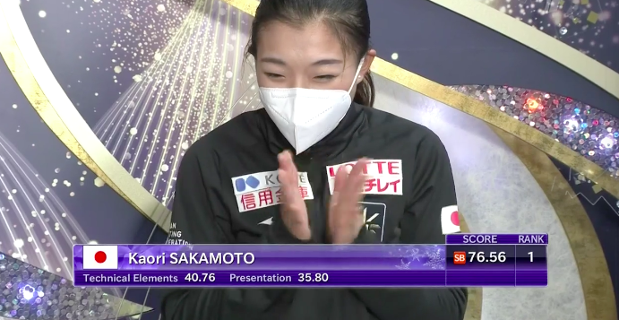 Оценка Сакамото из Японии за короткую программу — 76,56 балла. Она выигрывает короткую программу!