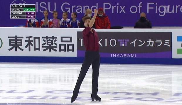 Начал с каскада 4 сальхов + 3 тулуп, потом сделал тройной аксель. Во второй части проката еще и чистейший четверной тулуп! Дорожка и вращения не подвели — четвертый уровень. Похоже, у нас будет новый лидер...