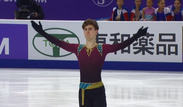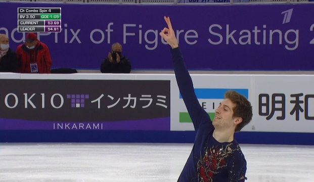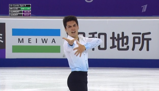 Тоже четверной сальхов в начале выступления, но с большой ошибкой на приземлении. Тройной аксель был хорошим. В каскаде за тройным флипом сделал только двойной тулуп вместо тройного. Вращения были четвертого уровня, как и дорожка шагов. Не все получилось, но достаточно интересный прокат.