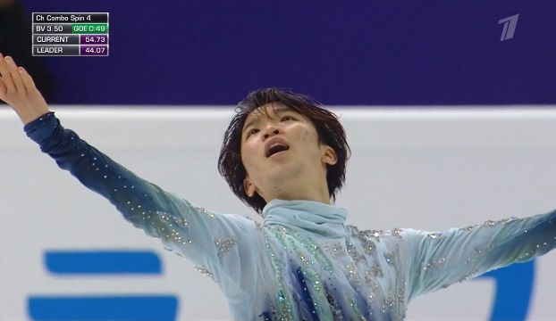 Каскад из четверного и тройного тулупов в начале на хороший плюс по GOE. Дальше чистый четверной сальхов — очень мощное начало. Во второй части программы был еще чистый тройной аксель, а все вращения и дорожка шагов были оценены четвертым уровнем. Ну что ж, шикарный прокат перспективного японца!