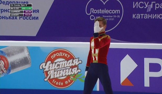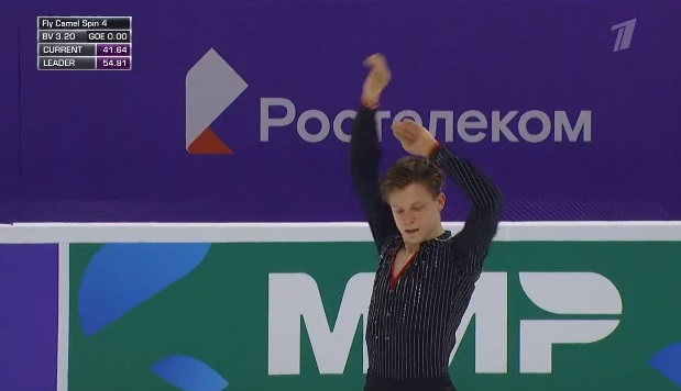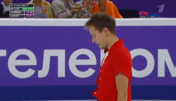 К сожалению, сразу же упал с четверного тулупа. Каскад 4 сальхов + 3 тулуп, напротив, сделал чисто. Но ошибка случилась и во второй части проката на тройном акселе, который он крайне неудачно приземлил. Но хоть вращения и дорожка на четвертый уровень. Жаль, конечно, много потерял.