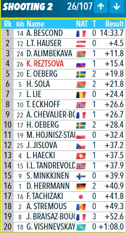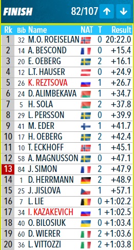 Казакевич 19-й была после второй стрельбы, а Кристина Резцова показывает на финише четвертый на данный момент результат, сдвинув на пятое место Динару Алимбекову из Белоруссии. Но еще Ройселанн финиширует. Как минимум она обойдет.