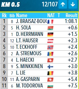 На первом огневом рубеже Херманн убежала на один штрафной круг. Ну а на первых 500 метрах лучший разгон уже принадлежит шведке Ханне Оберг. Но перевес над Бреза-Буше там символический — -0,3 секунды.