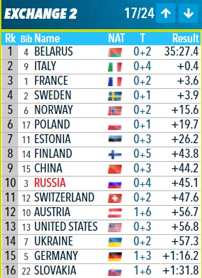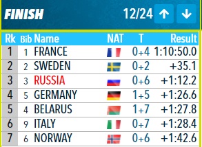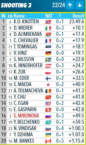 Белоруссия, Франция, Эстония, Германия и Швеция следом за лидерами бегут. Миронова попала первые четыре выстрела, но промахнулась пятым и закрылась доппатроном. 16-е место — +49,5.