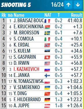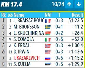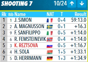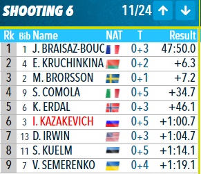 Шестой рубеж: У Бреза-Буше один промах, но она уходит лидером, хотя Кручинкина и Брурссон отстрелялись чисто! А вот Комола не обошлась без доппатрона, но закрылась первым же.