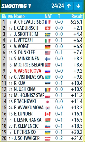 Первый рубеж: Васнецова стреляет чисто и выходит на девятое место с отставанием в 9 секунд. Лидирует же француженка.