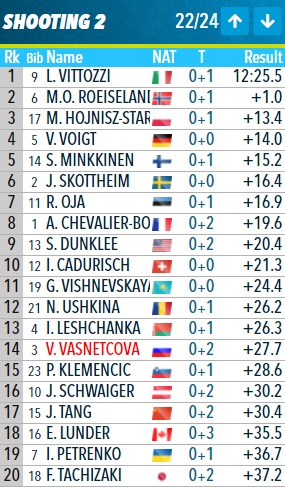 Второй рубеж: Витоцци быстро и точно стреляет, за ней без промахов закрывается Ульсбю-Ройселанд. Следом уходят Польша и Германия. Васнецова промахнулась в начале стрельбы, а потом и первый доппатрон смазала. В итоге из семи закрылась и ушла с рубежа 14-й. +27,7.