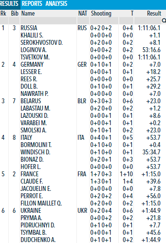 Италия первая с небольшим отрывом, за ней Жаклен, Лазовский, украинец Пидгрушный и Серохвостов. 16 секунд Россия проигрывает лидеру.