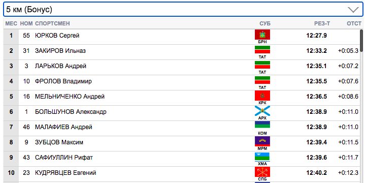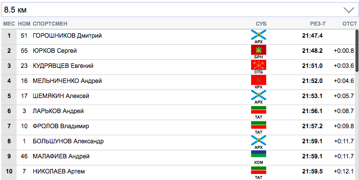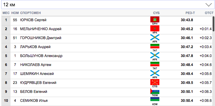 10 км. Горошников и Юрков продолжают лидировать. Большунов не отпускает их дальше 11 секунд. В топ-10 три представителя Архангельской области — Горошников (первый), Шемякин (пятый) и Большунов (девятый).