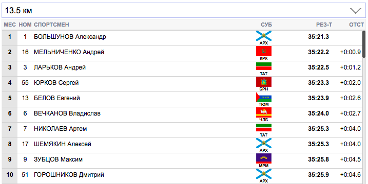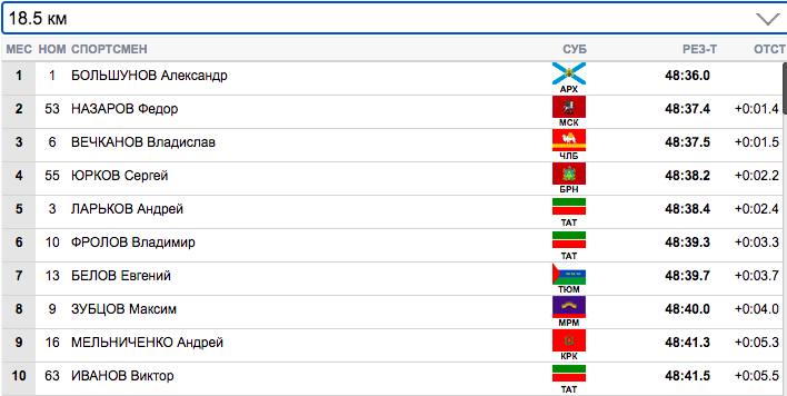 18,5 км. Большунов теперь вышел на первую строчку, а вот два других представителя Архангельской области — Шемякин и Горошников — вывалились из топ-10.