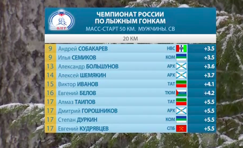 20 км. Большунов резко откатился на 13-ю строчку, но плотность такова, что его отставание от лидера составляет всего три секунды. Лидирует Андрей Ларьков из Татарстана — серебряный и бронзовый медалист Олимпийских игр — 2018.
