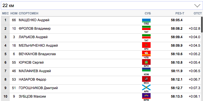 22 км. Большунов отстал от лидеров уже основательно — на 12 секунд (18-е место). На месте лидера происходит чехарда — теперь всех тащит Андрей Мащенко (Свердловская область).
