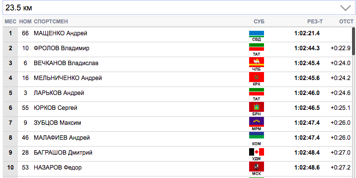 23,5 км. Мащенко лидирует с преимуществом в 23 секунды. Большунов проигрывает ему 30,7 секунды (17-е место).