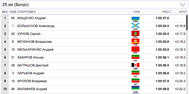 25 км. Мащенко продолжает лидировать, но Большунов сократил отставание от него с 30-ти секунд на 16,9 и идет вторым.