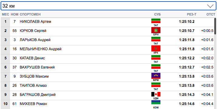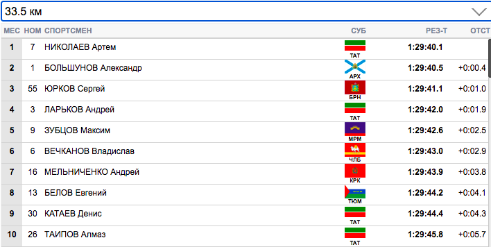 32 км. Бывший лидер Мащенко потерял силы и теперь занимает 22-ю строчку (+10 секунд до лидера). На первом месте идет Николаев (Татарстан), рядом с ним — Юрков и Ларьков. Большунов продолжает отдыхать на 13-м месте (+6,5 секунды).