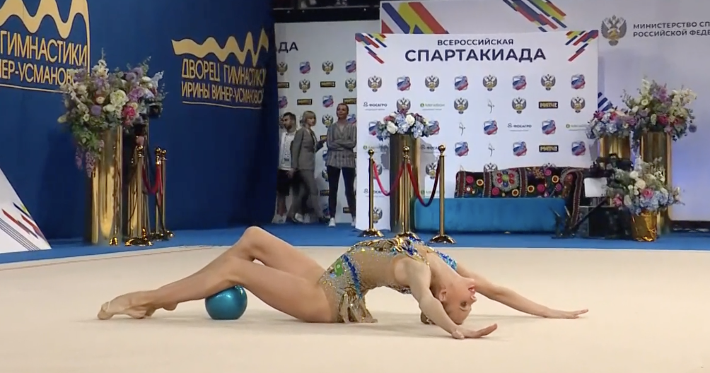 А тем временем, выходит мастер спорта международного класса из Ростовской области Софья Агафонова — она с обручем открывает сегодняшнюю программу второго потока участниц, среди которых также сестры Аверины и Лала Крамаренко.