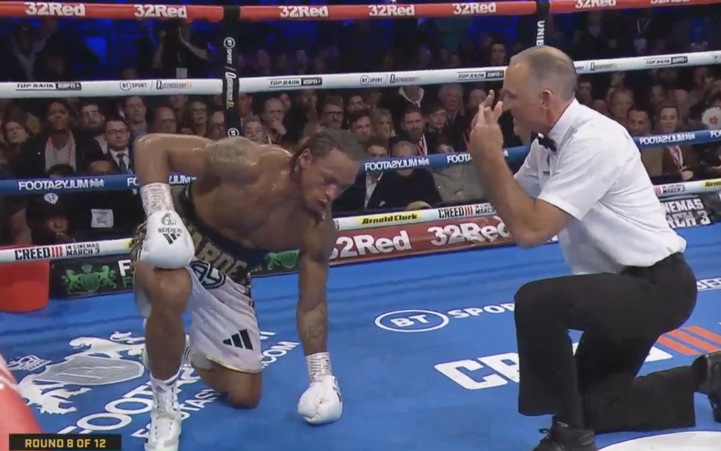 Первый нокдаун в 8 раунде! Оказывается на коленях Энтони, судья ждет решения спортсмена.