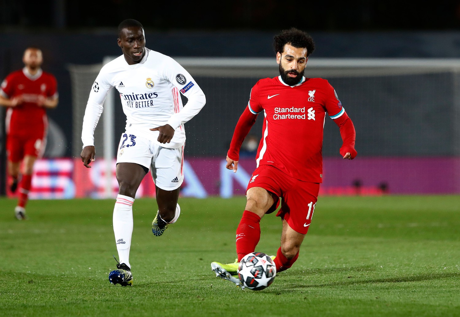 Потеряли мяч мадридцы в центре поля, его подхватил Салах, прокинул вперед и чуть не убежал один на один, так как Начо поскользнулся, но успел Менди подстраховать.