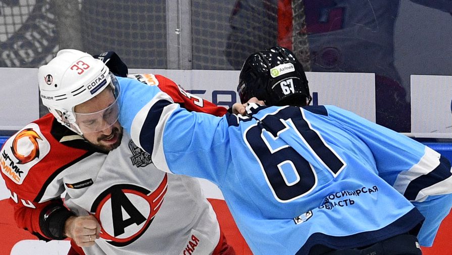 Хоккеист «Автомобилиста» Денис Бодров и игрок «Сибири» Андрей Ермаков в матче плей-офф Континентальной хоккейной лиги