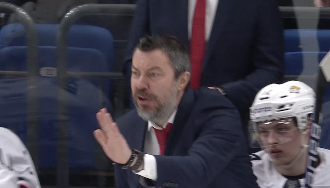 Илья Воробьев активно просит судью прояснить эпизод с игрой высоко поднятой клюшкой кого-то из своих подопечных, заряжая таким образом всех хоккеистов своей команды энергией.